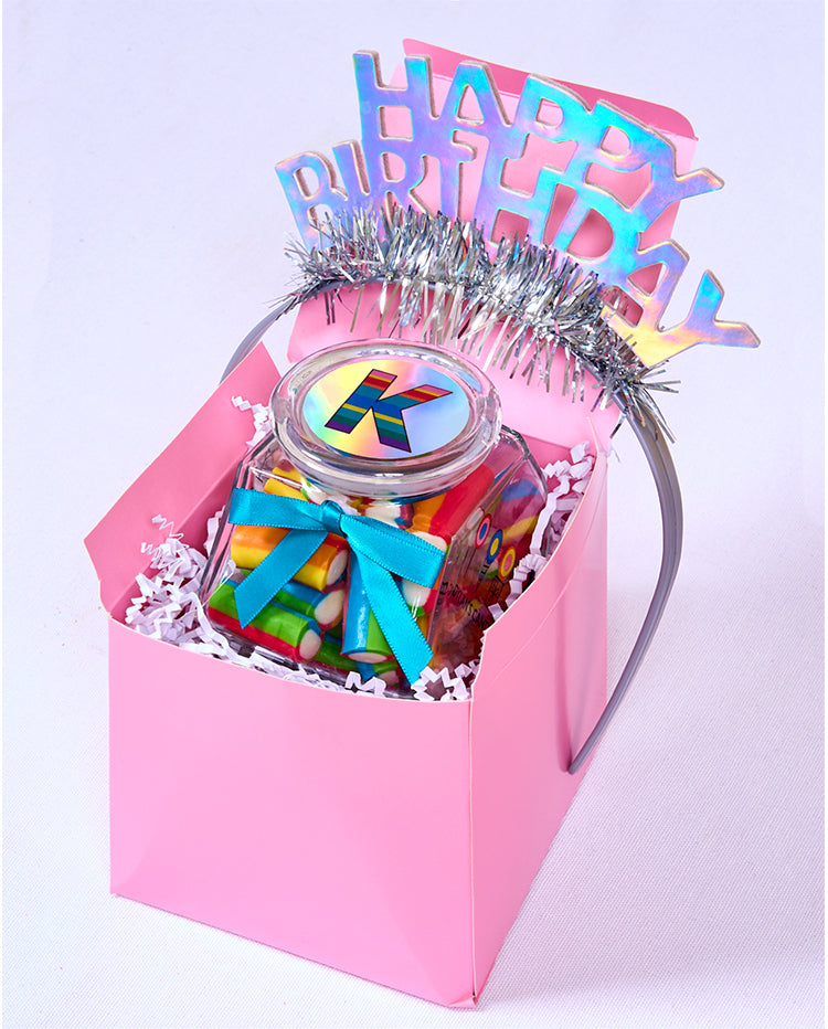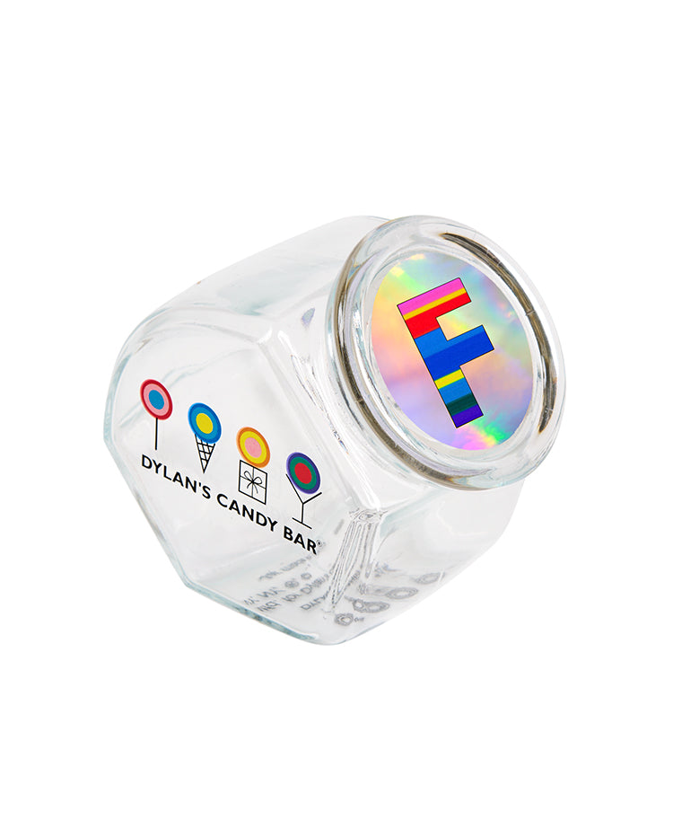 This personalized take on our classic candy jar sparkles with a metallic lid featuring a rainbow initial of your choice. Perfect for filling up with our Bulk Candy, our glass Personalized Mini Candy Jars make memorable gifts and party favors, are a great addition to your desk for school or work snacking, & more.