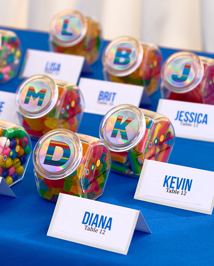 This personalized take on our classic candy jar sparkles with a metallic lid featuring a rainbow initial of your choice. Perfect for filling up with our Bulk Candy, our glass Personalized Mini Candy Jars make memorable gifts and party favors, are a great addition to your desk for school or work snacking, & more.